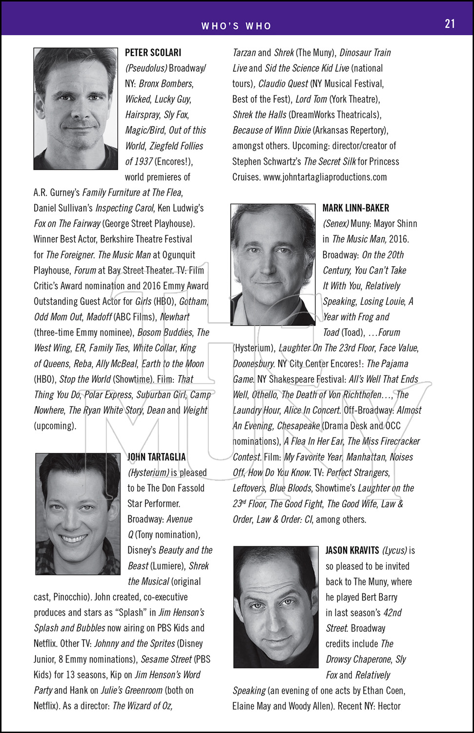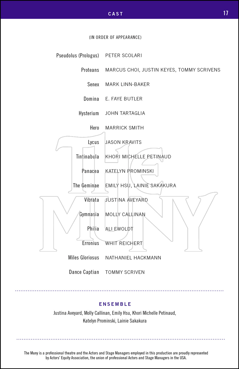 A bawdy musical romp through ancient Rome, with Pseudolous, a slave, contriving to earn his freedom. Complicating his life are the demands of his master, the romance between his master’s innocent son and a virgin courtesan, and a hint of the plague.